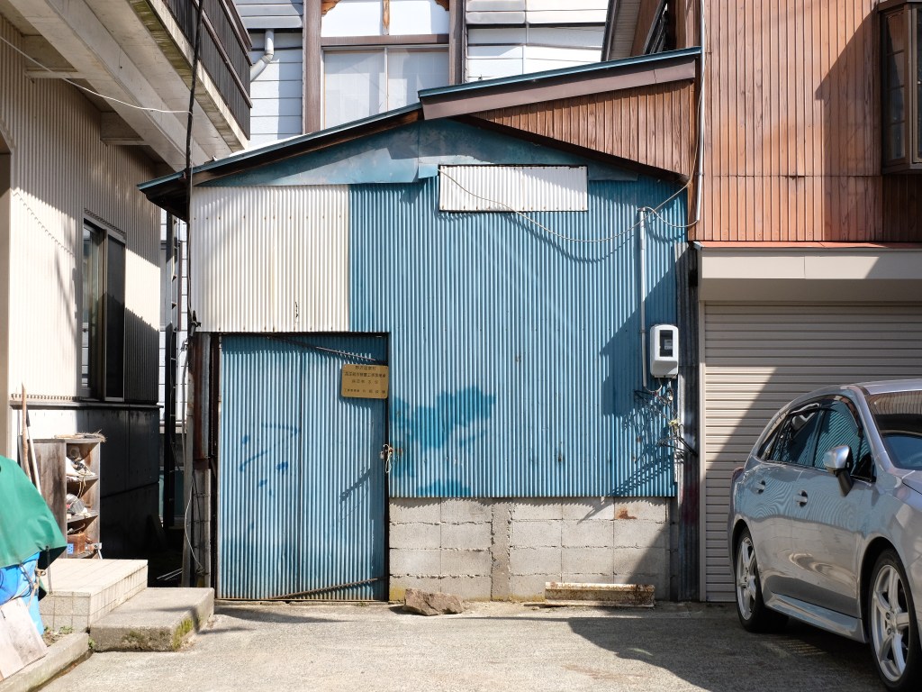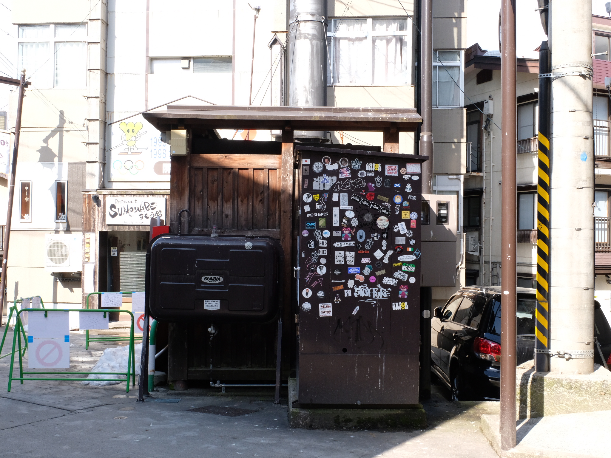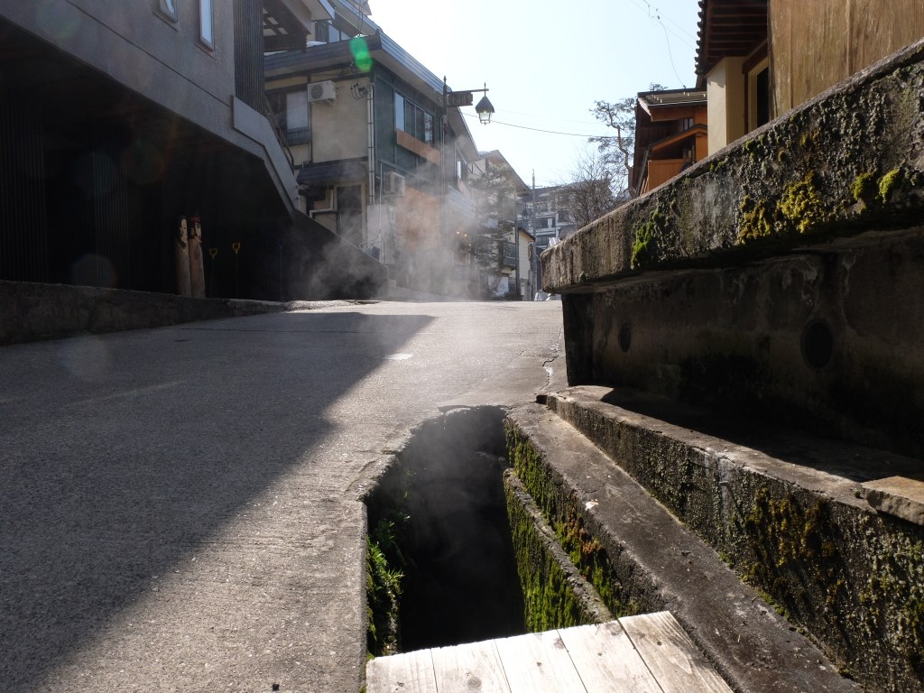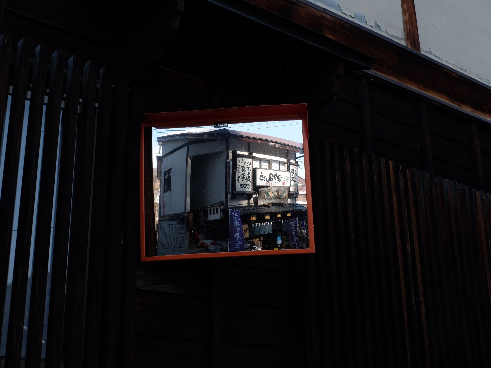 鏡に映る温泉まんじゅう屋さん。このあたりのお店の人たち、みんなバケツに温泉を汲んでいた。本当に日常的に使っているんだなぁ。